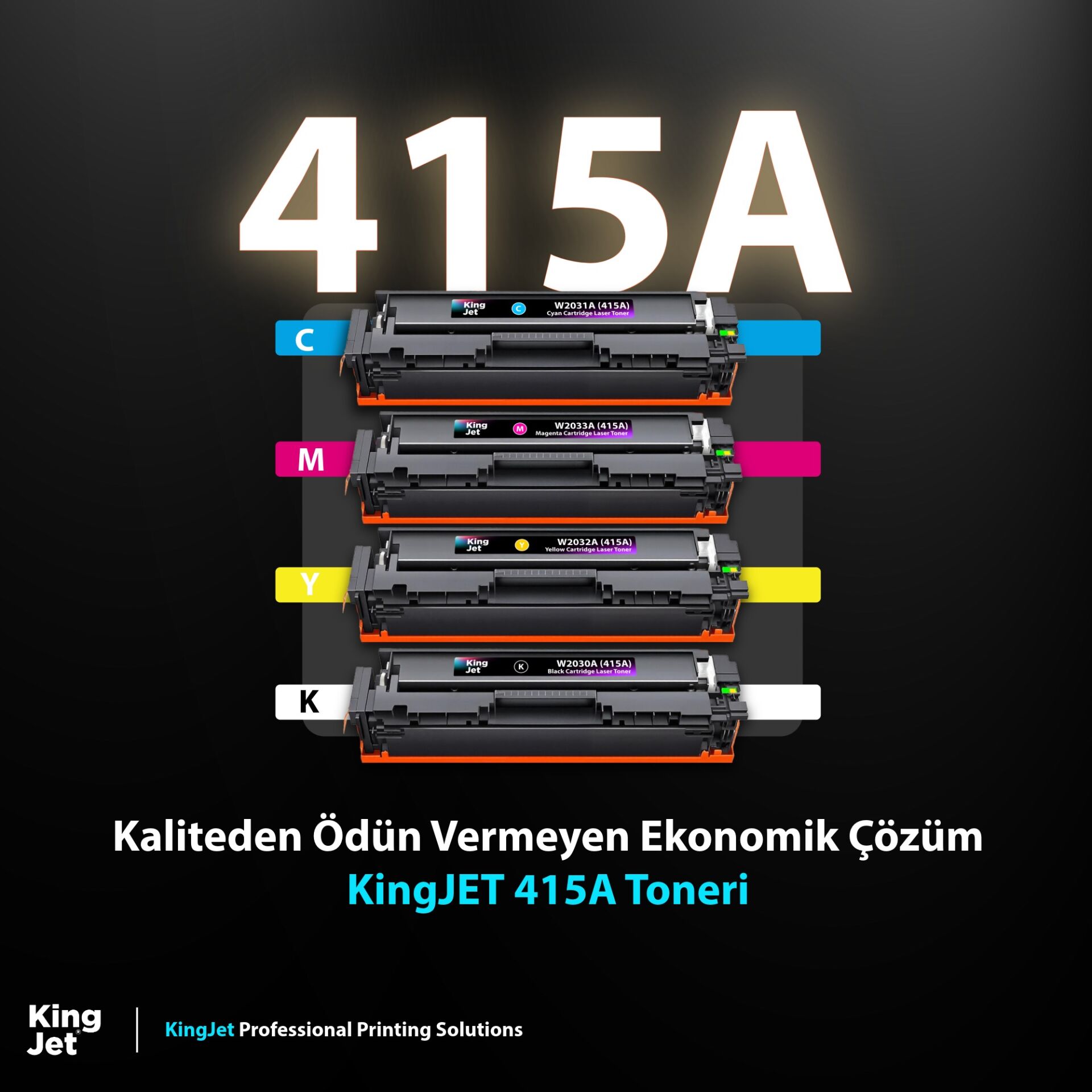 KingJET®️ W2030A, W2031A, W2032A, W2033A (415A) uyumlu standart kapasiteli Çipli 4 Renk Takım Toner – HP Color LaserJet Pro MFP M479fdw, M480f, M454dw, M455dw serisi yazıcılarla %100 uyumlu, profesyonel baskı kalitesi ve ekonomik çözüm.